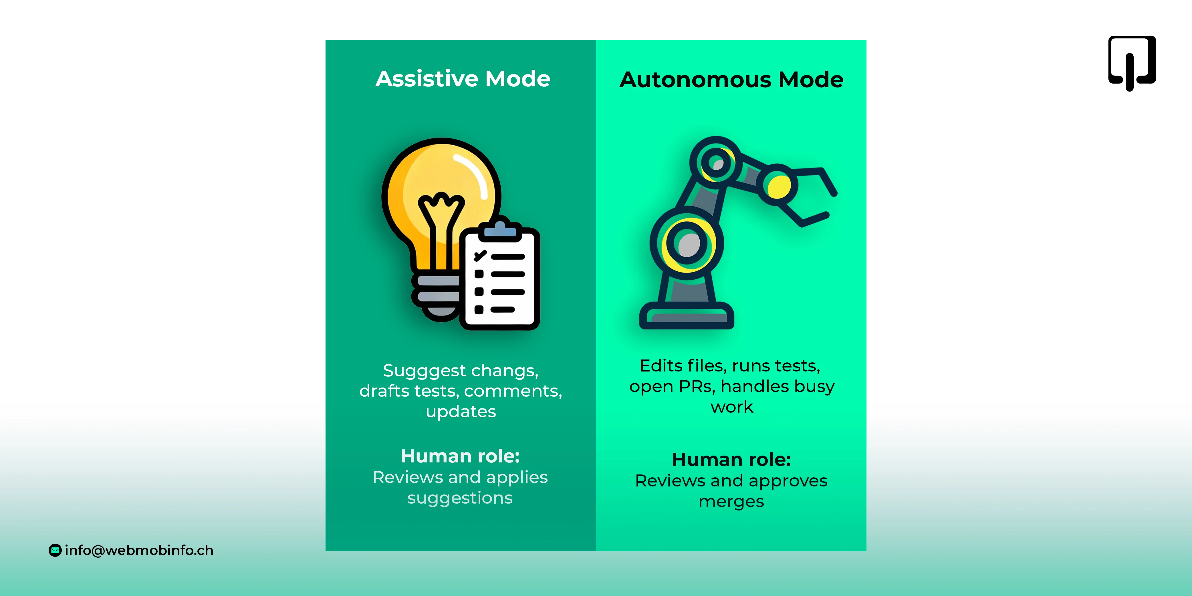 Yes. In assistive mode, they suggest edits and comments. In autonomous mode, they can branch, edit, run tests, and open PRs. Teams keep human reviews for merges.