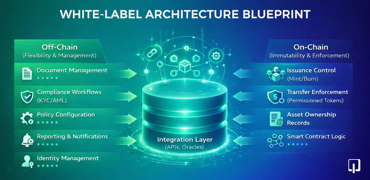 Off-chain systems handle document management, compliance workflows, policy configuration, reporting, and notifications. This separation allows platforms to adapt to regulatory change without constant contract redeployment.