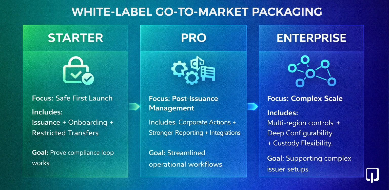 Packaging works best when it matches how issuers buy: they want a safe first launch, then expand capability once operations are stable. Tiers should be presented as maturity steps and as a feature bundle.