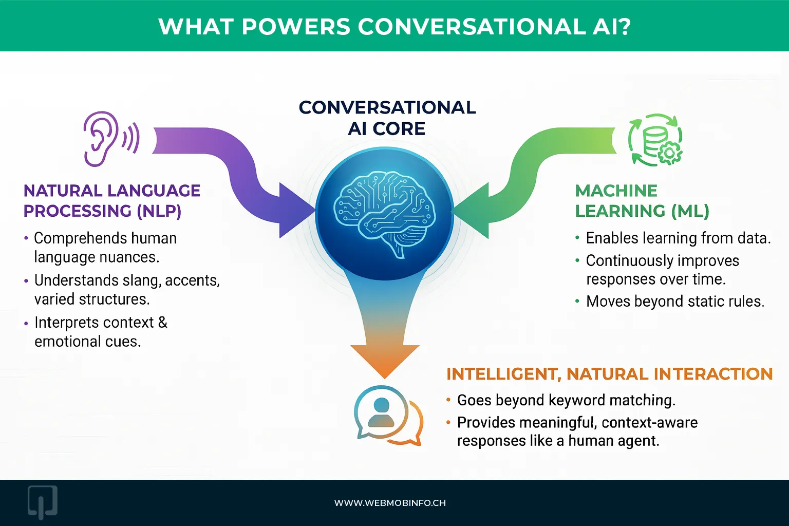 Conversational AI refers to the use of artificial intelligence to enable machines to understand, process, and respond to human language in a natural, intelligent way. Unlike traditional automated systems, conversational AI uses machine learning (ML) and natural language processing (NLP) to improve interaction quality.