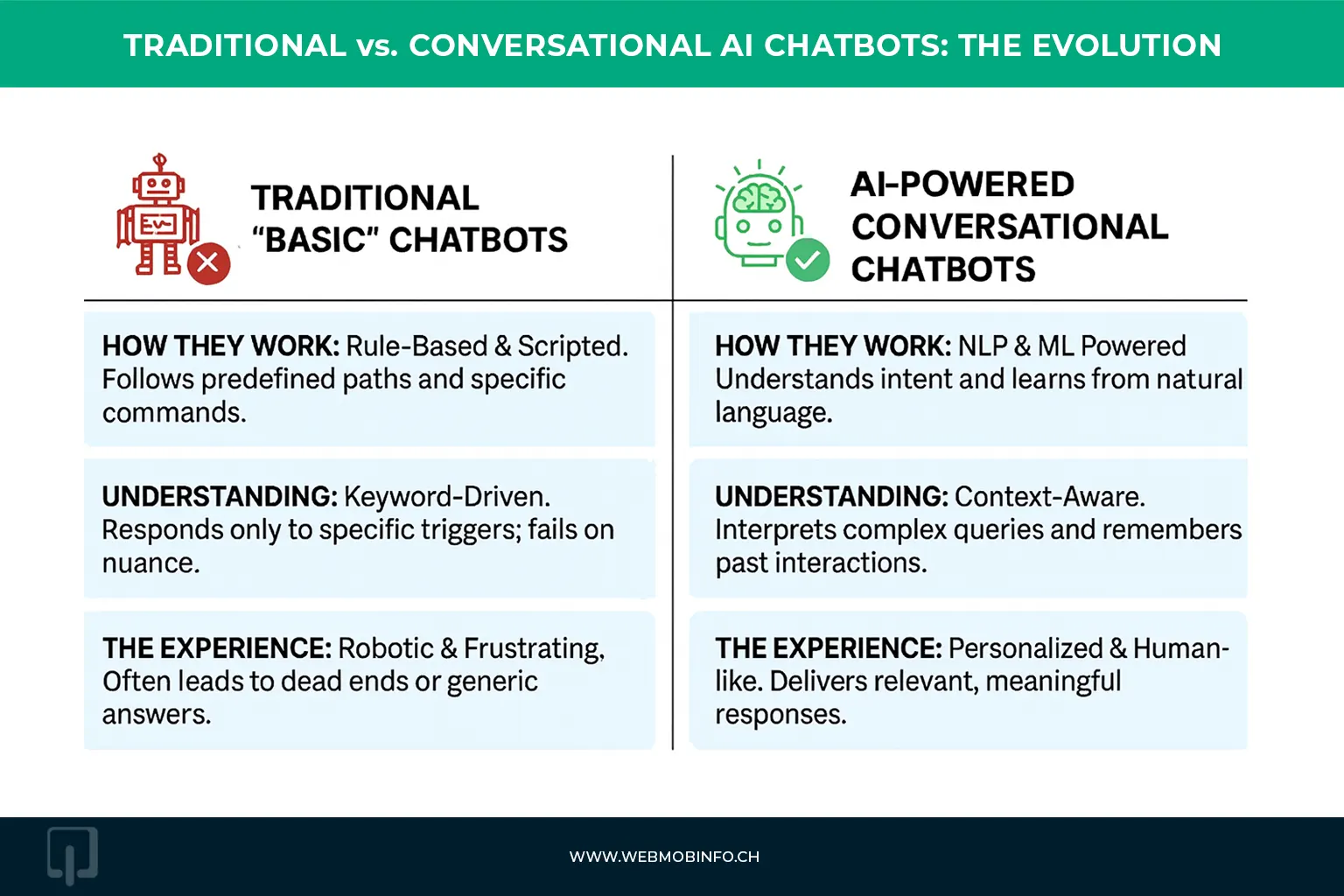 While both conversational AI and traditional chatbots aim to automate customer interactions, their core differences lie in their capabilities: