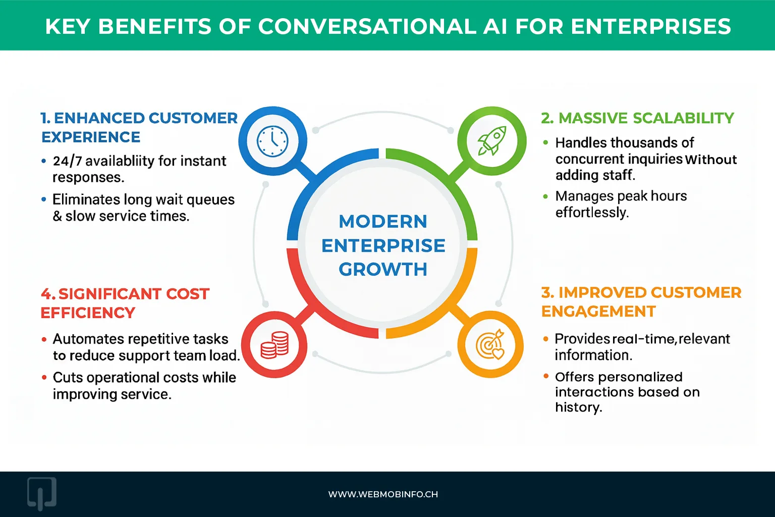 Implementing conversational AI chatbots offers several benefits for enterprises: