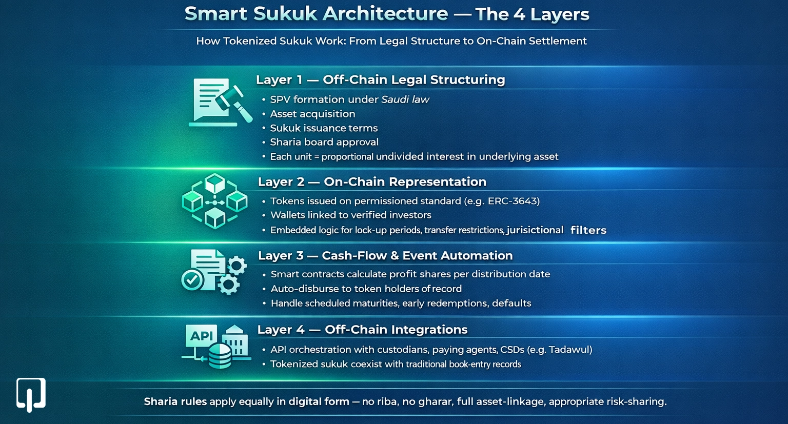 · Off-chain legal structuring: SPV formation under Saudi law, asset acquisition, sukuk issuance terms, and Sharia board approval. Each sukuk unit maps to a proportional undivided interest in the underlying asset.