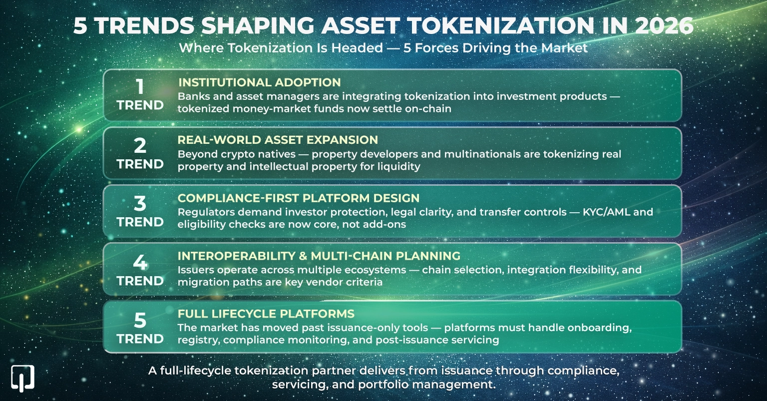 The market is moving beyond issuance-only tools toward platforms that support the full asset lifecycle. Businesses increasingly expect tokenization platforms to handle investor onboarding, ownership registry, compliance monitoring, and post-issuance servicing alongside token creation.