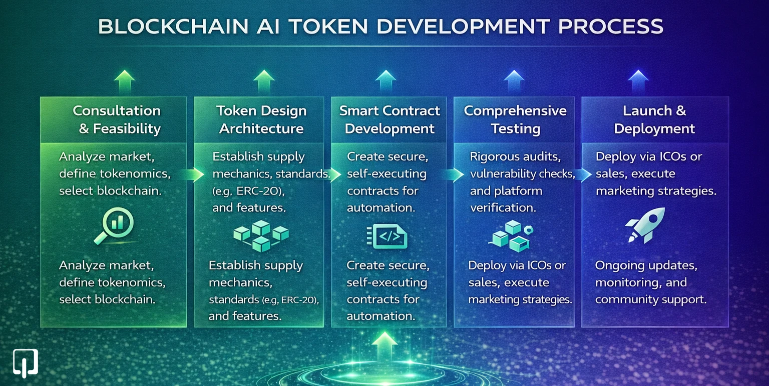 The AI token development process follows systematic stages from conception through post-launch optimization: